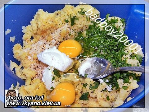Готовим как бы пюре, но еще добавляем тертый сыр, 2 яйца, мелко